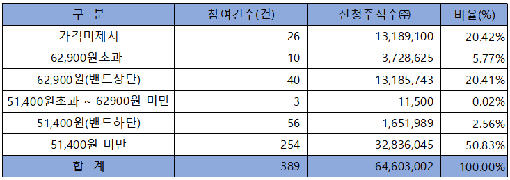 수요예측 참여 건수는 총 389건에 신청 주식수 64,603,002주로, 경쟁률 86.96 : 1의 아주 저조한 실적을 기록했습니다.