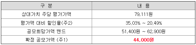 당초 공모 희망 가격 하단 51,400원 대비 14.4%하향 조정하여 공모 가격을 결정한 것입니다.