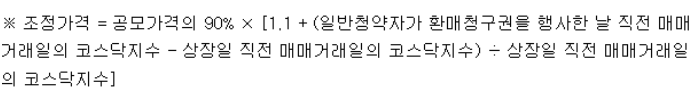 환매청구권 행사 가격은 공모가의 90%이나, 환매청구권 행사한 날 직전 매매거래일의 코스닥 지수가 상장일 직전 매매거래일의 코스닥 지수 대비 10%이상 하락한 경우에는 조정 가격이 적용됩니다.