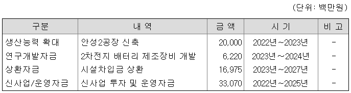 윤성에프앤씨는 이번 공모를 통해 조달된 자금으로 안성 2공장 신축 시설 투자에 200억원, 신사업투자에 337억원, 연구개발 자금으로 62억원을 사용하고, 기존 차입금 상환에 170억원을 사용할 계획입니다.