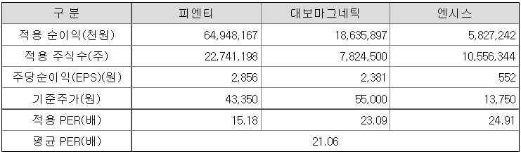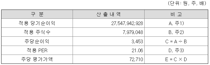 회사의 주당 평가가액은 2022년 반기 순이익을 연간 환산하여 순이익을 구하고 이를 바탕으로 주당 순이익을 구한 다음, 유사 회사의 평균 PER배수를 적용하여 산출한 것입니다.
