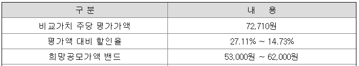 윤성에프앤씨의 희망 공모가격은 회사의 주당 평가가액 72,710원에서 27.11% ~ 14.73%를 할인한 가격입니다.