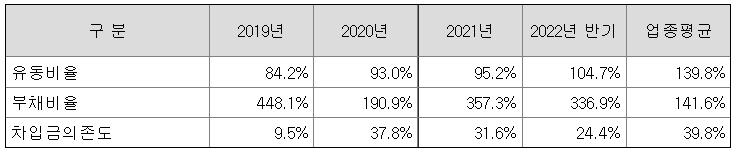 2022년에 들어서는 유동비율과 부채비율 모두 개선되고 있는데, 이는 부채 증가에도 불구하고 순이익이 증가하면서 늘어나는 부채를 상쇄하고도 남는 효과를 가져왔기 때문입니다.
