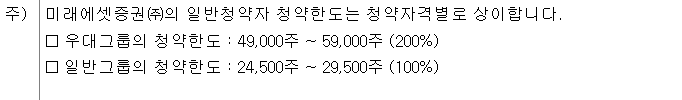 미래에세증권의 일반 청약자 배정 주식 수는 498,691주 ~ 598,429주이고, 일반 청약자의 최고 청약 한도는 일반 그룹 기준 24,500주 ~ 29,500주입니다.