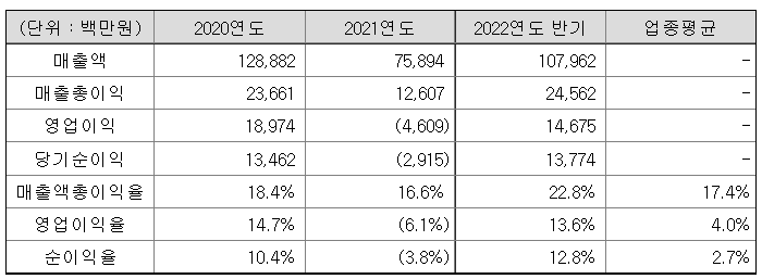 윤성에프앤씨의 매출액은 2019년 893억원에서 2020년 1조 2,882억원으로 증가했다가 2021년 코로나 사태로 빚어진 물류 대란으로 인해 수출 선적이 차질을 빚으면서 줄러들었다가 2022년 다시 회복하여 반기 기준 1조 79억원의 매출 실적을 기록하고 있습니다.