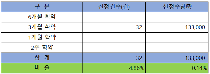 의무 보유 확약 건수도 32건 133,000주로 전체 신청 물량 대비 건수로는 4.86%, 수량으로는 0.14%에 불과했습니다. 32건 전체가 3개월 의무 보유 확약이었습니다.