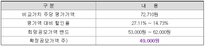 당초 희망 공모가격 하단 53,000원 보다 하향 조정하여 확정된 것입니다.