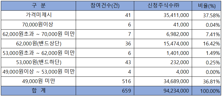 수요예측 참여 건수는 총 659건에 신청 주식수 94,234,000주로 경쟁률 67.49 : 1의 아주 저조한 실적을 기록했습니다.