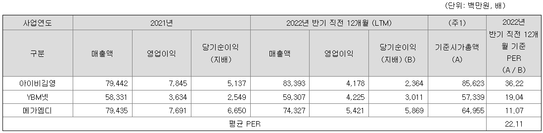 희망 공모가격 선정 시 유사회사로 국내 교육 관련 업체 3곳을 선정하였는데, 모두 상장 신청 회사보다 규모가 큰 업체라서 다소 높게 책정된 것이 아닌가 싶습니다.