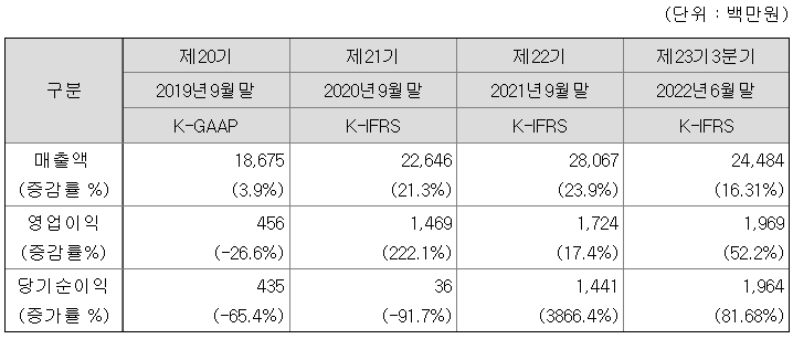 유비온의 매출액은 2019년 187억원에서 2021년 281억원으로 늘어났고, 2022년에는 3분기말 기준으로 245억원의 매출 실적을 달성하고 있습니다. 교육서비스의 비중이 점차 감소하고 에듀테크 분야 매출 비중이 높아지는 특징을 보이고 있습니다.