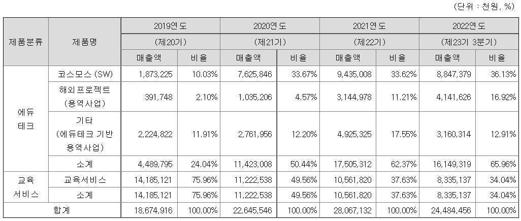 에듀테크 사업은 대학 학습관리시스템인 브랜드 명 '코스모스'를 중심으로 사업을 펼치는 외에도 해외프로젝트 사업과 에듀테크 기반 용역 사업으로 구성되어 있으며, 교육 서비스 사업은 고객 학습 유형에 따라 직업교육, 기업교육, 원격평생교육(학점은행제)로 구분해 볼 수 있습니다.