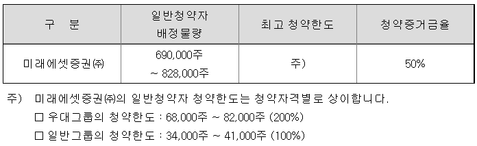 미래에셋증권의 일반청약자 배정은 690,000주 ~ 828,000주이고, 일반청약자의 최고 청약한도는 일반 그룹 기준 34,000주 ~ 41,000주입니다.