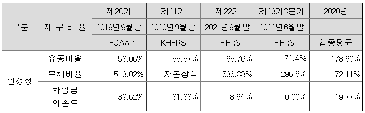 동사의 재무 구조는 2020년 상환전환우선주의 부채 인식으로 자본 잠식 상태였으나, 2021년 상환전환우선주의 보통주 전환으로 부채비율이 개선되었습니다.