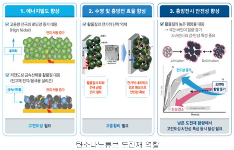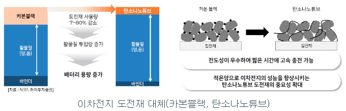 2차전지 양극재 도전재의 역할은 에너지 밀도를 향상하고, 2차 전지의 수명 및 충방전 효율 및 충방전 시 안전성을 향상하는 역할을 수행하는데, 탄소나노튜브가 기존의 카본 블랙을 빠르게 대체해나가고 있습니다.