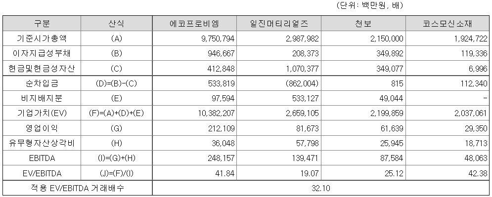 ※ EV/EBITDA : EV(Enterprise Value = 회사 가치) / EBITDA는 회사의 가치가 회사의 현금 창출 능력 대비 몇 배인지를 나타내는 지표로, 공모주 절차 진행 시 회사의 현재 또는 미래 EBITDA를 구하고, 유사회사의 EV / EBITDA 배수를 구한 다음 두 수치를 곱하여 회사의 가치를 구한 후 상장 예정 주식수로 나누어 주당 평가가액을 산출합니다.