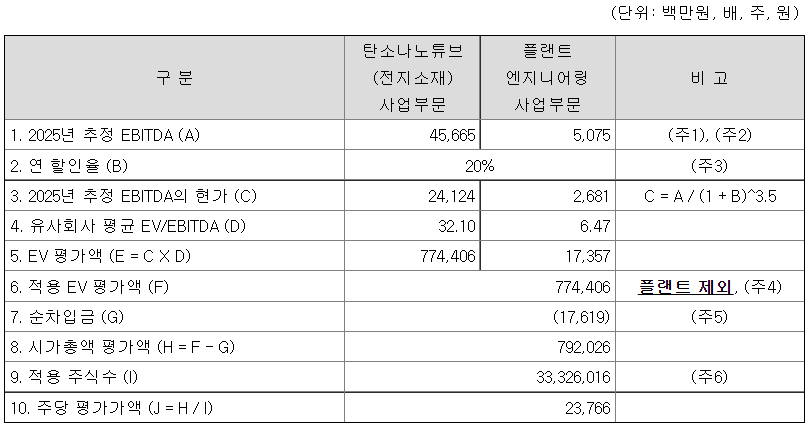 또, 희망 공모가 산정 시 2025년 미래 추정 손익을 사용하였고, 플랜트엔지니어링 부문의 가치를 배제하고 보수적으로 계산하였다고 설명하고 있지만, 2차전지 관련 유사 회사로 선정된 업체들이 업계 선발 주자로 가치가 높다는 점에서 공모 가격이 높게 책정되었다는 생각을 떨쳐버리기 어렵습니다.