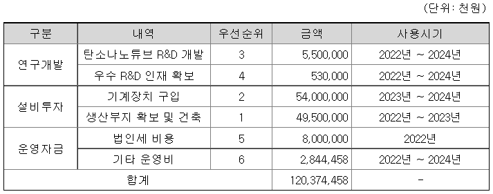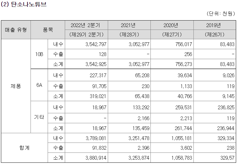 한편, 탄소나노튜브사업은 동사가 자체 연구 개발한 기술을 바탕으로 2차전지 양극재의 도전재로 쓰이는 제품을 생산 판매하는 사업입니다.