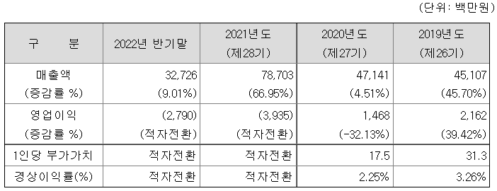 제이오의 매출은 플랜트엔지니어링 부문과 탄소나노튜브 부문으로 나누어 볼 수 있는데, 플랜트 엔지니어링부문은 2019년과 2020년 447억원과 460억원의 매출 실적을 기록하였고, 2022년 반기 기준 289억원의 꾸준한 매출을 나타내고 있으며, 탄소나노튜브 사업은 2019년 3억원 매출에서 출발하여 2022년 반기 현재 39억원의 매출 실적을 달성하면서 빠르게 성장하고 있습니다.