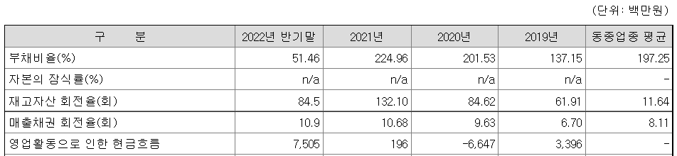 제이오의 부채비율은 2022년 전환상환우선주의 보통주 전환으로 반기말 기준 51.46%의 부채비율을 기록하고 있어, 동업종 평균 대비 양호한 실적으로 나타내고 있습니다.
