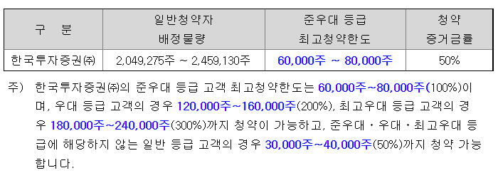 한국투자증권의 일반청약자 배정은 2,049,275주 ~ 2,459,130주이고, 일반청약자의 최고 청약한도는 일반 등급 기준 30,000주 ~ 40,000주입니다.
