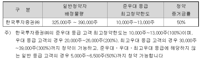 한국투자증권의 일반 청약자 배정주식은 325,000주 ~ 390,000주이고, 일반 청약자의 최고 청약한도는 일반 그룹 기준 5,000주 ~ 6,500주입니다.
