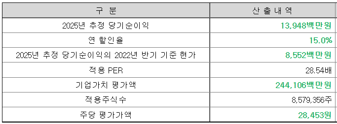 회사의 주당 평각가액은 2025년 추정 순이익을 2022년 현재로 현가 환산한 후, 유사회사의 평균 PER배수를 적용하여 산출된 회사 가치를 주식 수로 나누어 산정한 것입니다.