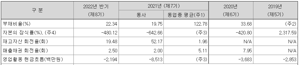 동사는 아직까지 영업 활동으로 인한 현금 흐름을 창출하지 못하고 있어 자본 잠식 상태입니다.