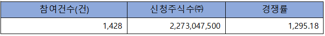 수요예측 참여 건수는 총 1,428건에 신청 주식수 2,273,047,500주로, 경쟁률 1,295.18 : 1의 좋은 실적을 기록했습니다.