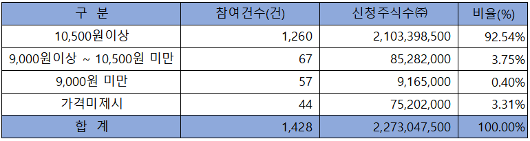 수요예측 참여 건수는 총 1,428건에 신청 주식수 2,273,047,500주로, 경쟁률 1,295.18 : 1의 좋은 실적을 기록했습니다.