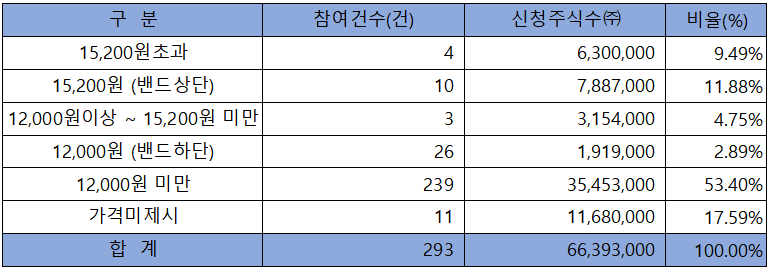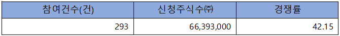 수요예측 참여 건수는 총 293건에 신청 주식 수 66,393,000주로 경쟁률 42.15 : 1의 저조한 실적을 기록했습니다.