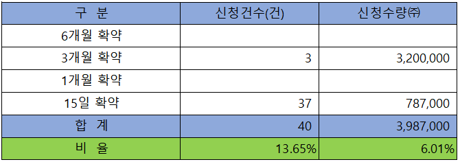 의무 보유 확약 건수는 40건에 3,987,000주로 전체 신청 물량 대비 건수로는 13.65%, 수량으로는 6.01%였습니다.