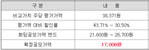 공모 가격을 당초 희망 공모가 하단 대비 21.3% 하향 조정한 17,000원으로 확정하였는데, 이것이 일반 청약자의 관심을 얼마나 끌 수 있을지 미지수입니다.