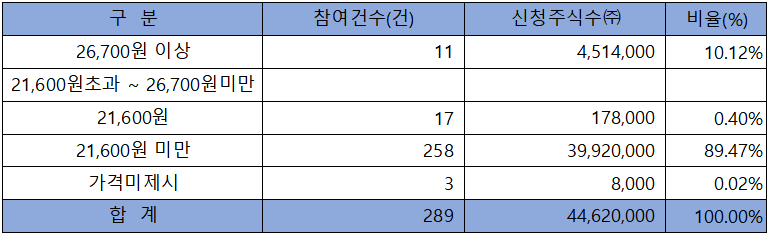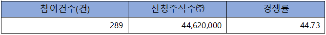 수요예측 참여 건수는 총 289건에 신청 주식수 44,620,000주로 경쟁률 44.73 :1의 아주 저조한 실적을 기록했습니다.