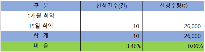 의무 보유 확약 건수는 10건에 26,000주로 전체 신청 물량 대비 건수로는 3.46 %, 수량으로는 0.06%로 주식 수가 적어 의미가 없는 결과입니다.