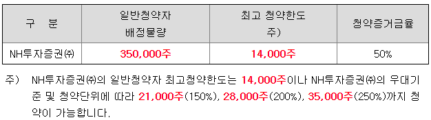 - 청약 가능 증권사 : NH투자증권