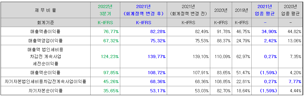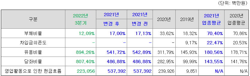동사는 2020년부터 시현한 수천억원대 당기 순이익을 사내에 유보하면서 재무 안전성을 우수한 수준으로 개선하였습니다. 부채비율은 2022년 3분기 말 현재 12.09%를 기록하고 있어 동업종 평균 대비 매우 양호한 실적을 나타내고 있으며, 차입금 의존도는 2020년 창출된 잉여 현금으로 차입금을 전액 상환하여 증권신고서 제출일 현재 무차입 경영을 실현하고 있습니다.