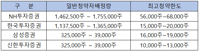 - 청약 가능 증권사 : NH투자증권, 한국투자증권, 삼성증권, 신한투자증권