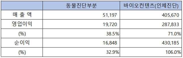 물론 512억원의 매출액에 영업이익률 38.5%를 기록한 동물진단 부분도 실적이 나쁘다고 할 수는 없습니다.