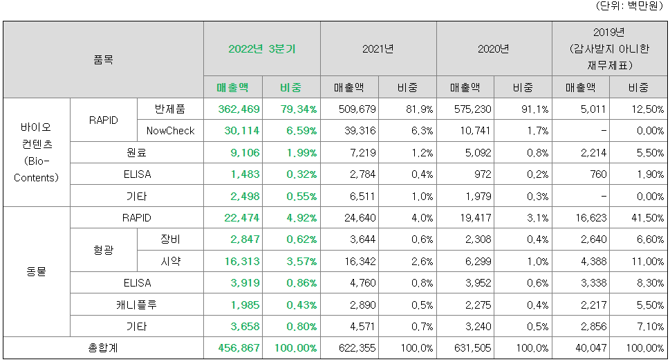 동사는 주요 제품을 포함하여 총 170여 종의 진단키트, 분석장비, 진단 시약 등의 다양한 동물용 체외진단 제품 포트폴리오를 보유하고 있으며, 이 외 코로나19를 포함하여 다양한 질병, 질환 관련 인체용 진단키트, 항원 및 항체, 진단시약 등 다양한 인체용 진단 관련 제품 또한 자체적으로 개발, 보유하고 있습니다
