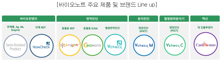 바이오노트의 동물용 주요 제품으로는 신속면역화학진단 브랜드 BIONOTE Rapid, 효소면역반응 진단 브랜드 BIONOTE ELISA, 면역화학 형광 진단 제품인 Vcheck F가 있습니다.