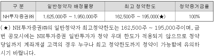 NH투자증권의 일반청약자 배정은 1,625,000주 ~ 1,950,000주이고, 일반 청약자의 최고 청약 한도는 162,500주 ~ 195,000주입니다.