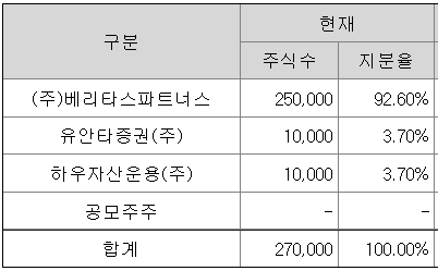 유안타 스팩 12호의 최대 주주는 (주)베리타스파트너스로 92.60%의 지분을 보유하고 있으며, 유안타증권과 하우자산운용이 각각 3.70%를 보유하고 있습니다.