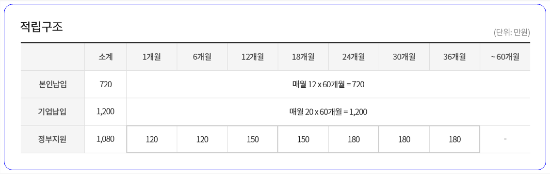 '정부, 중소(중견)기업 사업주, 청년 핵심인력(만15세 이상 34세 이하, 6개월 이상 재직 중인 정규직 근로자)이 공동으로 적립한 공제금을 가입기간(5년)에 따라 장기재직한 청년 핵심인력에게