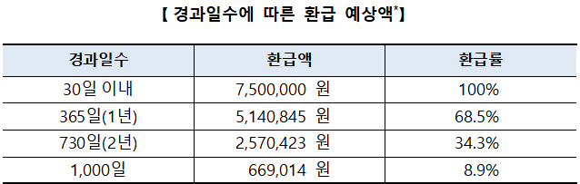 예를 들어 주택 가격 5억원이고, 초기보증료 750만원을 납부 한 경우 경과 일수에 따라 초기보증료 환급 금액은 아래 표와 같습니다.