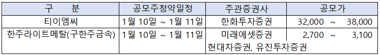 6곳 중 1곳은 작년 12월 공모 청약 일정을 1월로 미룬 한주라이트메탈입니다.