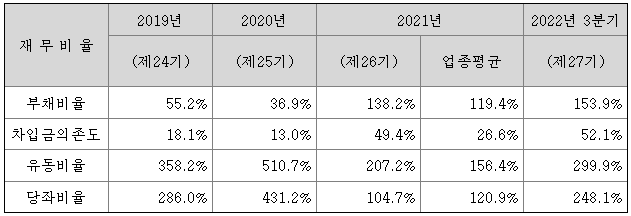동사의 부채 비율과 차입금 의존도는 최근 매출 신장에 따라 재고 확보를 위한 차입금 증가로 업종 평균보다 높은 수치를 보이고 있습니다만, 매출과 재고자산의 회전이 안정을 찾으면 개선될 것으로 전망하고 있습니다.