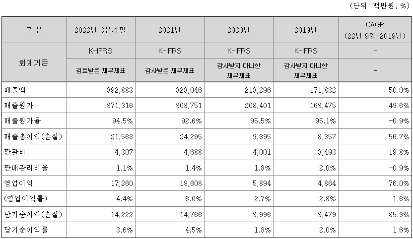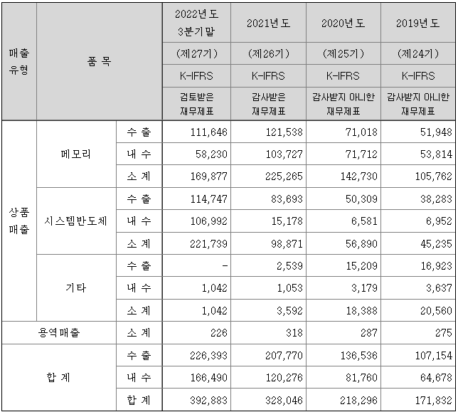 특히, 2021년과 2022년 3분기말까지의 매출 실적은 전년 대비 50%대의 높은 성장세를 나타내고 있는데, 이는 신규 개척한 시스템 반도체의 매출 증가에 따른 것입니다.