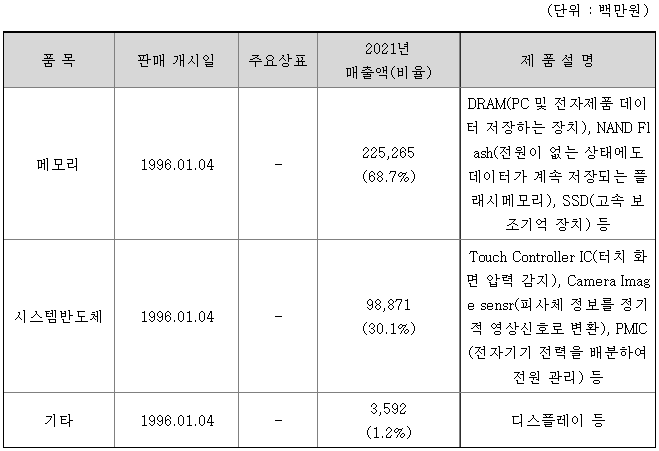 동사가 공급하는 대표적인 상품으로는 메모리 반도체로 DRAM, NAND Flash, SSD 등이 있고, 시스템 반도체로는 Touch controller IC, Camera Image Sensor, PMIC 등이 있으며, 일부 제품의 경우 Foundry 형태로도 공급하고 있습니다.
