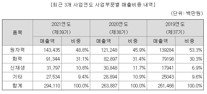 수산인더스트리의 매출액은 2019년 2,614억원에서 2021년 2,941억원으로 성정하였으며, 2021년 기준 원자력 48.8% 신재생 10.8%의 비중을 보이고 있습니다. 원자력 분야의 정체에 대한 대책으로 신재생발전 분야의 비중을 높이고 있는 것이 눈에 띕니다.