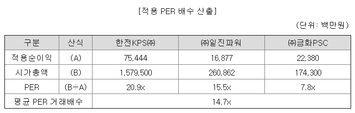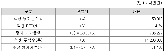 회사의 주당 평가가액은 2021년 1분기 기준 지난 1년간 연결 당기순이익 500억원에 유사 회사의 평균 PER 14.7배를 적용하여 산출된 것입니다. 유사 회사로는 한전 KSP(주), (주)일진파워, (주)금화 PSC 3개 회사가 선정되었습니다.